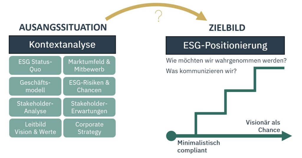Minimal compliant oder Wettbewerbsvorteil? Risiko oder Chance? Wie möchten Sie von Ihrem Umfeld wahrgenommen werden und welche Marktposition streben Sie an? Es liegt an Ihnen, im ESG-Kontinuum Ihre passende Position zu definieren. Denn fest steht: was Sie kommunizieren, muss Ihrer Positionierung und Ihren Taten entsprechen!